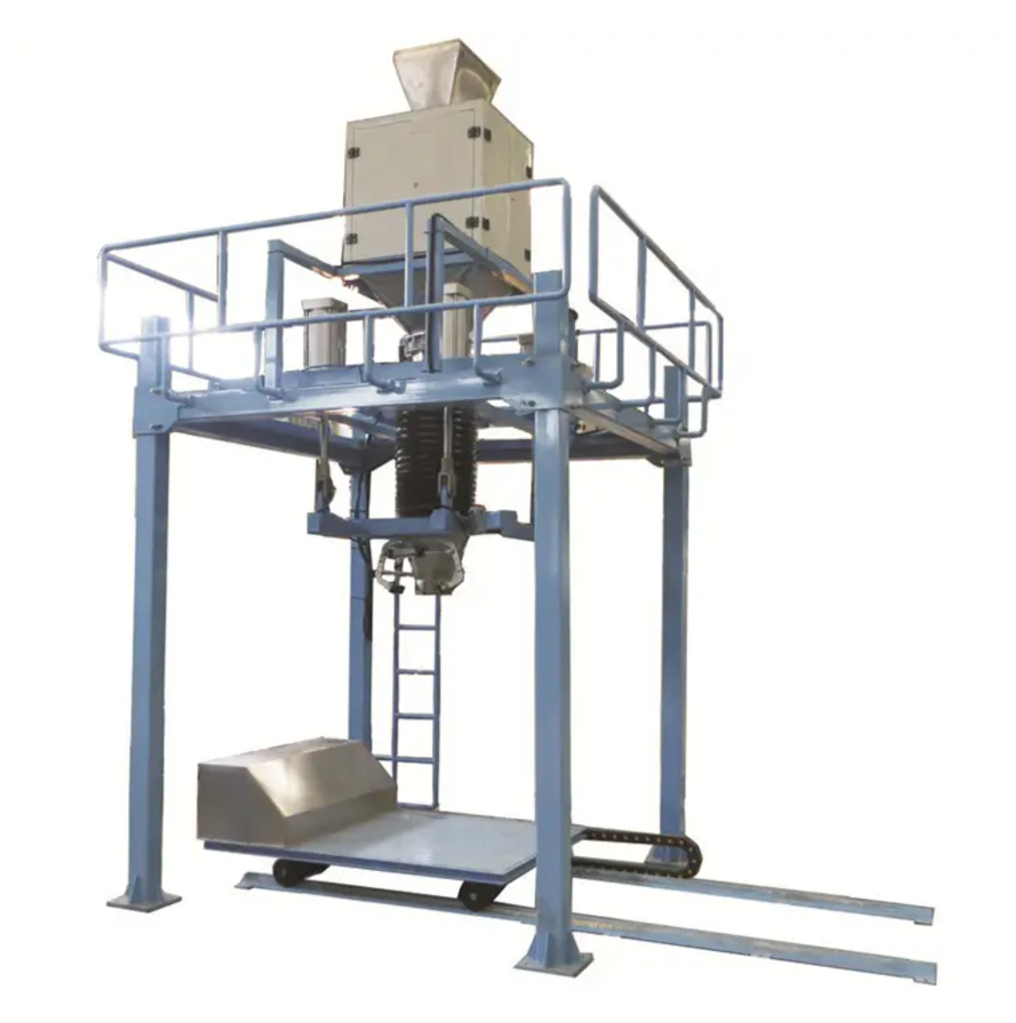 包括氣動掛勾夾包系統,充氣回氣機構,進料計量控制機構,液壓升降機構,輸送滾道,電氣控制等。